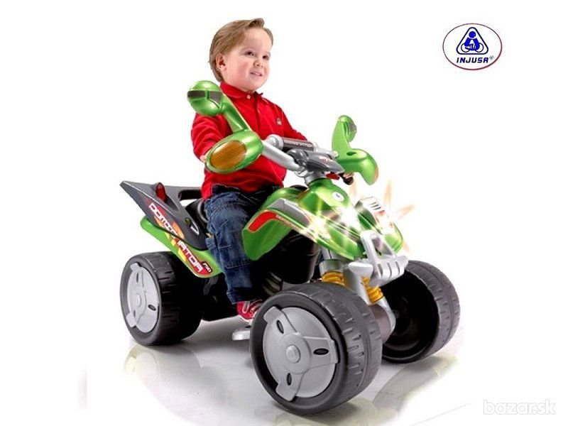 Mantis Dominator 12V jednomiestna detská elektrická štvorkolka je považovaná za špičku na trhu s detskými elektrickými vozidlami. Jednorýchlostná štvorkolka poháňaná elektrickým motorom napájaným 12V batériou je vhodná predovšetkým na spevnený a trávnatý povrch. Rýchlosť štvorkolky sa ovláda stlačením pedálu pravou nohou (akcelerátor) a uvoľnením pedálu začne sama brzdiť. Dodávaná vrátane batérie a nabíjačky. Pôvodná cena: 204 EUR Akciová cena: 165 EUR Cena dodania: 8,50 € s DPH. Na objednávku. Dodacia doba: 1 - 2 týždne Veková kategória: +2 roky Počet miest na sedenie: 1 Batéria: 12V Počet el.motorov: 1 Počet rýchlostí: 1 Minimálna doba jazdy s plne nabitou batériou: cca 2 - 3 hodiny Doba nabíjania batérie: cca 10 - 12 hodín Maximálna rýchlosť: cca 4 - 5 km/h Maximálna nosnosť: 30 kg Hmotnosť: 12,6 kg Dĺžka: 87 cm Šírka: 48 cm Výška: 68 cm Rozmery balenia: 76 x 48 x 42 cm Záruka: 24 mesiacov Certifikát: ISO 9001:2001 - celosvetovo uznávaný certifikát kvality Svetelné a zvukové efekty Bezpečnostné krytky rokovätí Akcelerátor aj brzda integrované v jednom pedáli. Široké kolesá s dezénom zaručujúperfektnú stabilitu. Štvorkolka je vybavená blatníkmi. Ľahko zvládne aj mierne stúpanie do 10%. Použité len kvalitné a zdravotne nezávadné materiály.