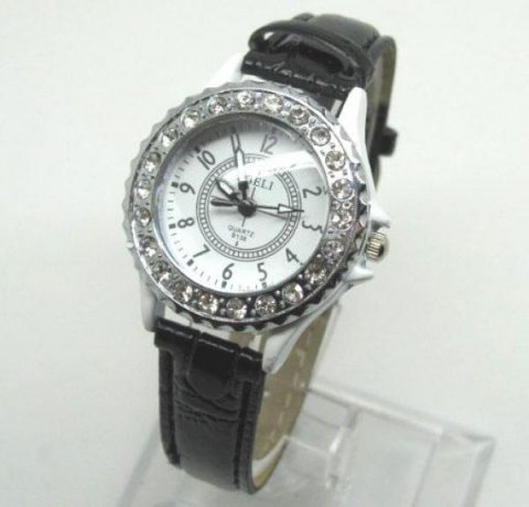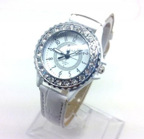 Predám hodinky s nádychom luxusu vďaka jemným kryštálikom krásne sa lesknúcim okolo ciferníka hodiniek priemeru 3,9 cm, kožený remienok vo farbe bielej a čiernej má dĺžku 19,5 cm