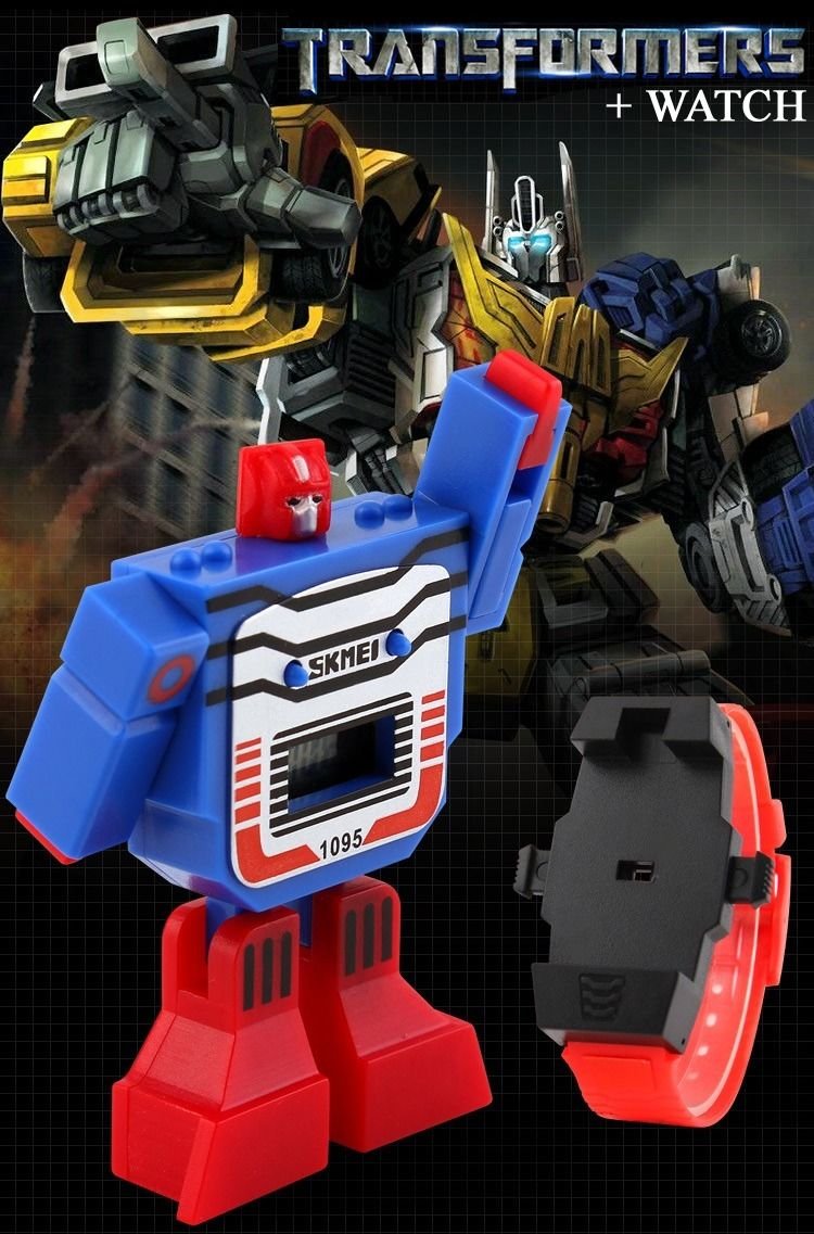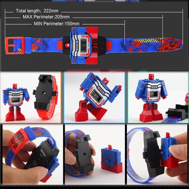 Predám nový typ digitálnych hodiniek perfektná kombinácia : hodinky a hračka transformers v jednom ! Moderný, športový dizaj, digitálny displej, ľahká demontáž transformera. Priemer ciferníka cca 4,5 cm, vzorovaný silikonový remienok má dĺžku 22 cm. Parádny darček pre deti !