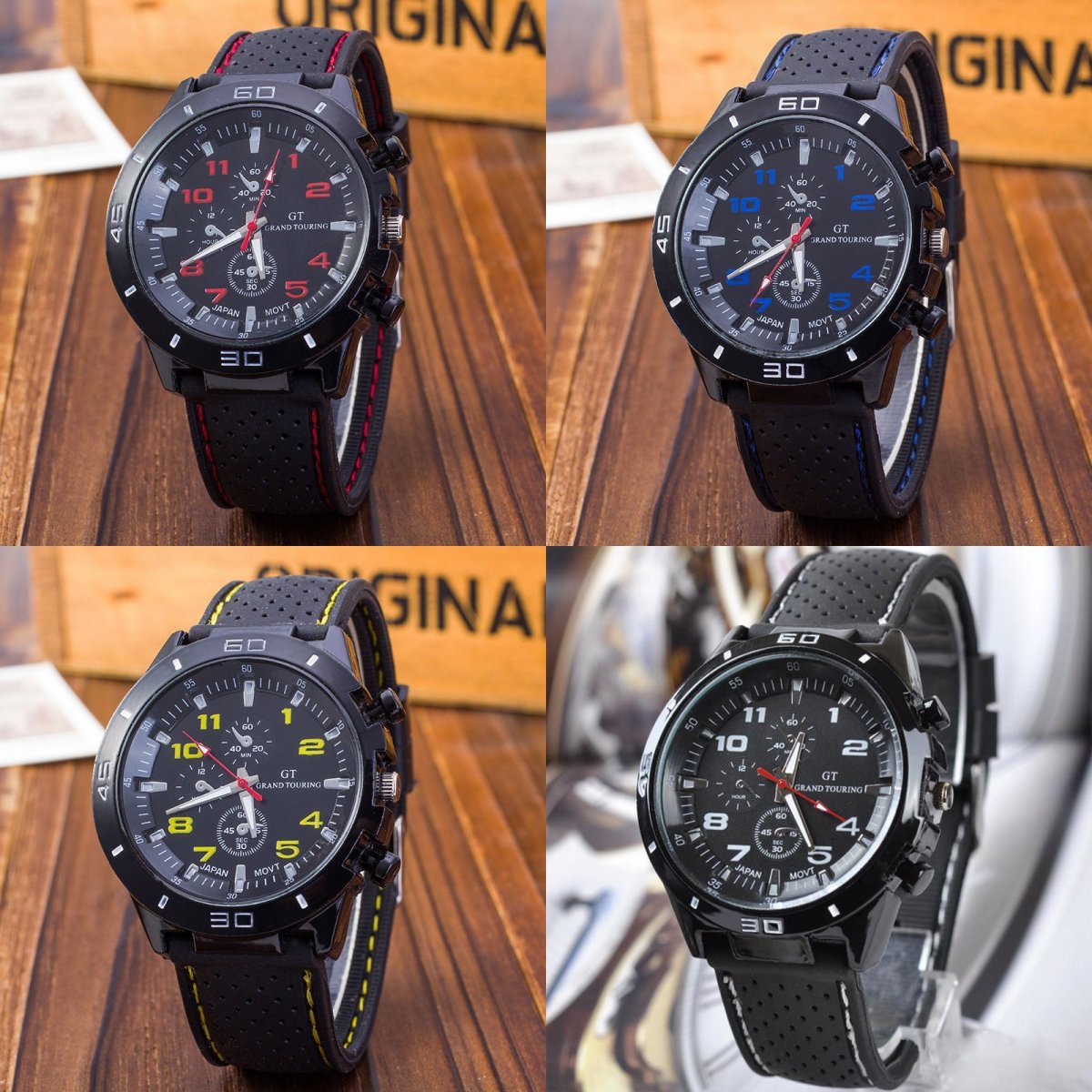 Predám nové módne elegantné pánske hodinky športového dizajnu z nerezovej ocele zn. GT Grand Touring. Quartz strojček, kvalitný silikonový remienok dĺžky 24,5 cm s farebným vzorom na kraji remienka ladí s farebne značeným číselníkom v ciferníku priemeru 2,2 cm