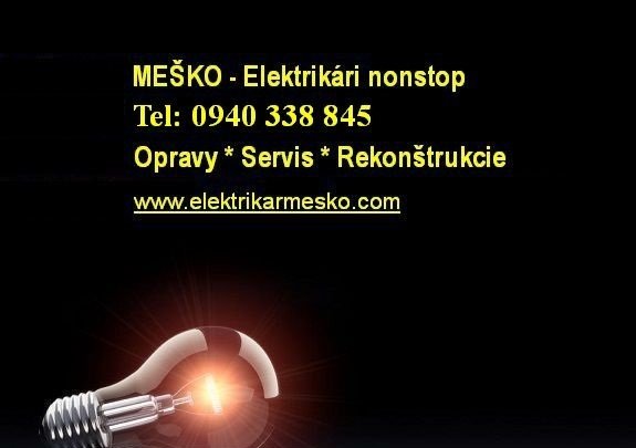 Opravy,montáž a servis bytovej a domovej elektroinštalácie,opravy a výmeny svietidiel,zásuviek,ističov,vypínačov,elektroskriniek,káblov,opravy elektrospotrebičov a elektrického náradia,opravy a výmeny ventilátorov / kúpeľňové a izbové diagnostika/opravy prerušených káblov v stenách a podlahách rekonštrukcie kompletné aj malého rozsahu.Montáž a zapojenie kuchynských elektrospotrebičov,varné dosky,digestory,elektrické rúry a sporáky. Práca aj cez víkendy. www.elektrikarmesko.com
