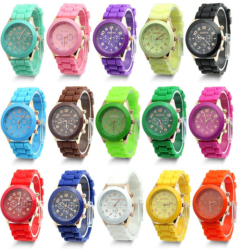 Predám nádherné elegantné dámske náramkové hodinky zn. Geneva vo výrazných pastelových farbách. Ciferník aj remienok hodiniek je v rovnakej farbe, v ciferníku veľkosti 3,8 cm sú hodiny a ručičky krásnej zlatočervenej farby, minúty zaujímavo riešené po boku ciferníku. Silikonový vzorovaný remienok, príjemný na nosenie je dĺžky 24,5 cm, váha hodiniek len 48g.