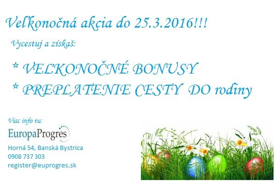 Opatrovanie: NEMECKO, RAKÚSKO!!! 1200 – 1700€ netto /mes. + VEĽKONOČNÉ BONUSY Pri vycestovaní do 25.3.2016 – PREPLATÍME CESTU DO RODINY! Umiestnenie IHNEĎ: veľký výber rodín. Žiadne sprostredkovateľské poplatky! Voľné rodiny: http://www.euprogres.sk/index.php?m=002-18 KONTAKT: EuropaProgres: 0908737303, email: register@euprogres.sk