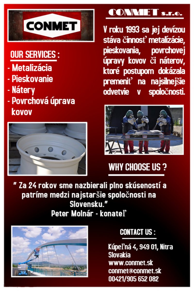 Pomaly,ale isto prichádza zimná sezóna, a v prípade že ste unaví pri pohľade na váš záhradný kovový nábytok, my sa oň radi postaráme (opieskujeme, natrieme,...),aby ste sa z neho na jar mohli tešiť tak, akoby bol nový. Zároveň ponúkame aj pieskovanie diskov a ich pripravenie na nadchádzajúcu sezónu. V neposednom rade je i čas na opieskovanie a nový náter pluhov a iných častí priemyselných strojov,.... Nový kabát budú do leta potrebovať aj detské preliezky, tak ak patríte k zodpovedným rodičom, ktorí chcú pre svoje dieťa len to najlepšie, prosím kontaktuje nás a môžme sa dohodnúť na výhodnej akciovej cene, pretože tiež máme deti a na ich šťastí nám záleží. Spoločnosť CONMET je k dispozícií aj v zimnej sezóne, tak nás neváhajte kontaktovať, na: 0905 652 082, conmet@conmet.sk alebo nás kontaktuje priamo cez správy na FB. Ďakujeme.