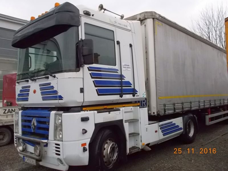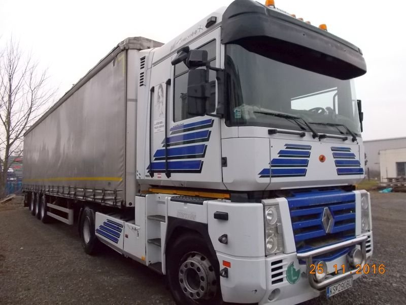 Predám biely ťahač Renault Magnum 480, r.v. 2003, 353 kW, manuálna 16-st. prevodovka, EURO 3, najazd. 973 000 km, ABS, výstražné oranž. svetlá, rádio, klíma, el. okná a zrkadlá. Veľmi dobrý stav. STK+EK do 6.6.2017, ciachovanie tachografu platí do 23.10.2017. Valníkový náves FRUEHAUF Maxispeed (Francúzsko), r.v. 2006, 3 nápravy, ABS, prevádzková hmot. 6740 kg, 3-stranná rolovačka, zdvíhacia náprava. Rozmery ložnej plochy 13,625 x 2,48 m. STK do 6.6.2017. Všetky pneumatiky na súprave skoro nové. Cena za súpravu 9000 EUR (10800 s DPH) alebo ťahač 6500 EUR (7800 s DPH), náves 3500 EUR (4200 s DPH).