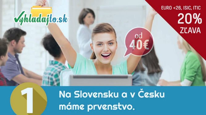 Ste študentom vysokej školy a hľadáte čo najlepšie a najkvalitnejšie zdroje pre písanie záverečnej práce, no nemáte dostatok času na behanie po knižnici? Vyriešime to za vás. Ponúkame prvotriedne služby v oblasti vyhľadávania materiálov v elektronickej podobe a vypracovania podkladov k záverečným prácam či už ide o bakalárske práce, diplomové práce, rigorózne práce, dizertačné práce alebo iné. Stačí zadať tému a my vám dodáme podklady k záverečnej práci. Ceny už od 40 eur, zľava 20% pre držiteľov platnej karty EURO - 26, ISIC alebo ITIC . Aby vaše štúdium bolo radosťou, nie starosťou. Bližšie info aj na https://www.vyhladajto.sk.