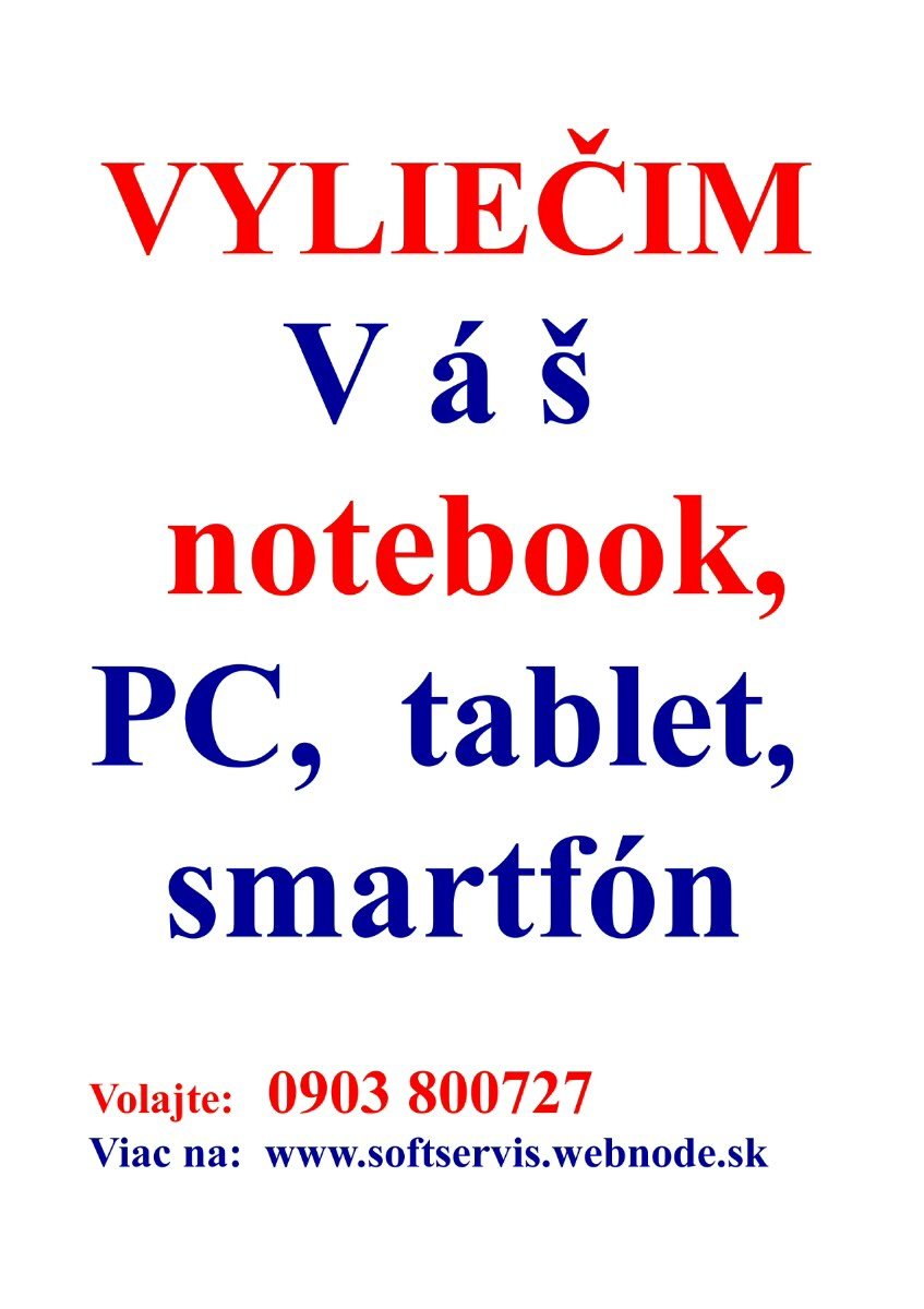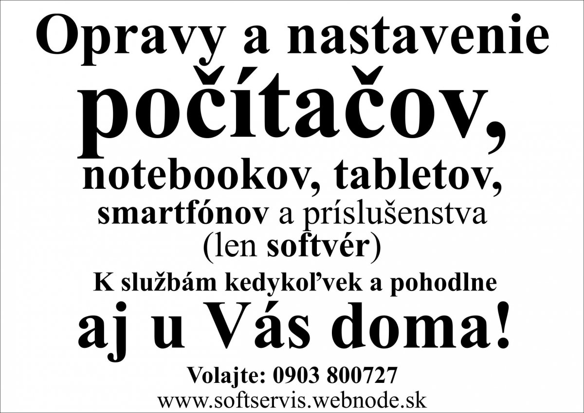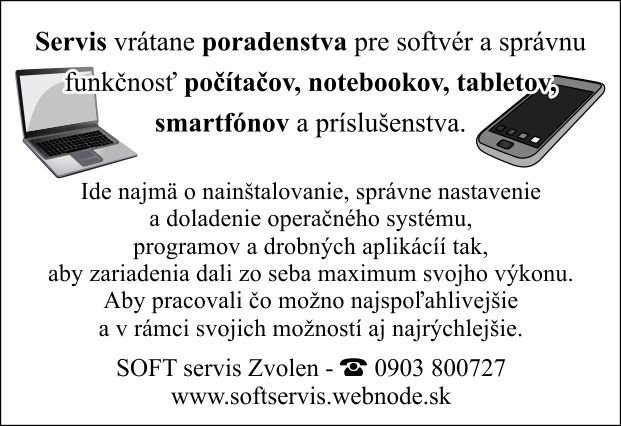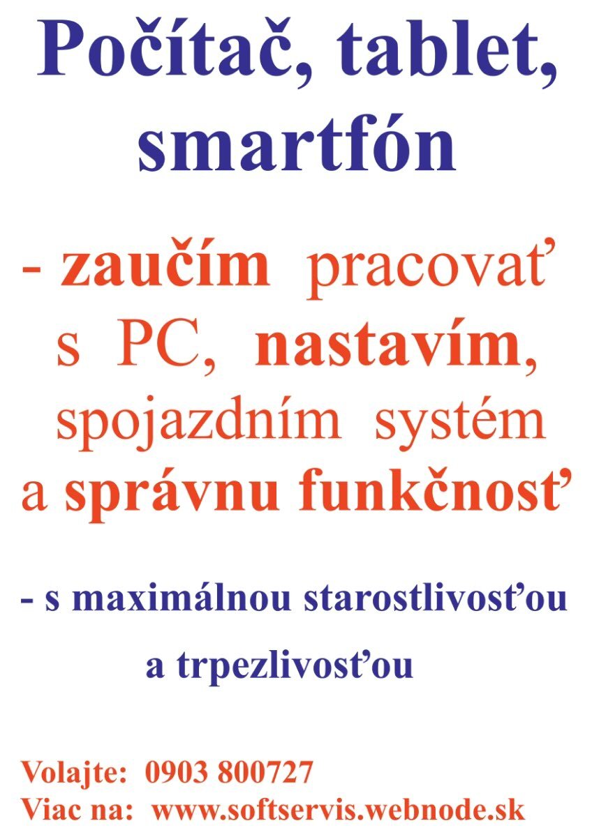Ponúkam služby v oblasti servisu a poradenstva pre softvér, funkčnosť a správne prepojenie informačno - komunikačných zariadení, akými sú najmä notebooky, netbooky, stolové PC, tablety, smartfóny, mobilné telefóny, externé zariadenia a rôzne príslušenstvo. Zaučím pracovať začiatočníkov aj pokročilých, mladých, starších aj najstarších s týmito zariadeniami - s maximálnou starostlivosťou a trpezlivosťou. Vypracujem návrh inovácie zariadení, ako aj najoptimálnejšieho internetového pripojenia a ďalších telekomunikačných služieb v danej lokalite podľa technológie, poplatkov a využiteľnosti služieb na základe presných potrieb klienta. Vyhotovím jednoduché web stránky, bez nutnosti pravidelných poplatkov. www.softservis.webnode.sk