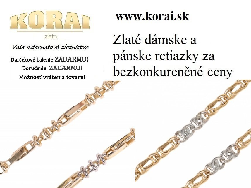 V ponuke internetového obchodu so šperkami KORAI nájdete skutočne široký výber zlatých retiazok určených pre dámy ako aj pre pánov. Zlaté retiazky ponúkame vo viacerých dĺžkach a vo viacerých farebných prevedeniach. Na výber tak máte retiazky z bieleho zlata, retiazky zo žltého zlata, retiazky z kombinovaného žlto - bieleho zlata ako aj retiazky zo žlto - červeného zlata. Navštívte internetové zlatníctvo KORAI a zaručene si vyberiete. E - shop KORAI. Navštívte e - shop KORAI a zaručene si vyberiete. E - shop KORAI Vaše internetové zlatníctvo ponúka zlato. Internetové zlatníctvo KORAI. Online šperky KORAI, zlato. Online zlatníctvo KORAI.