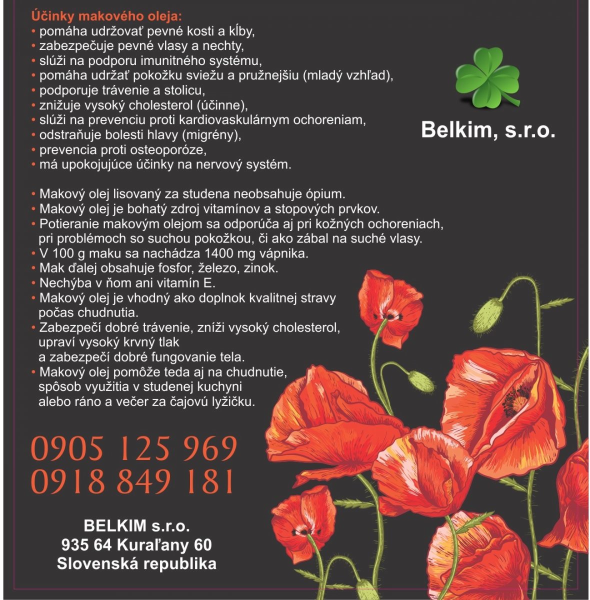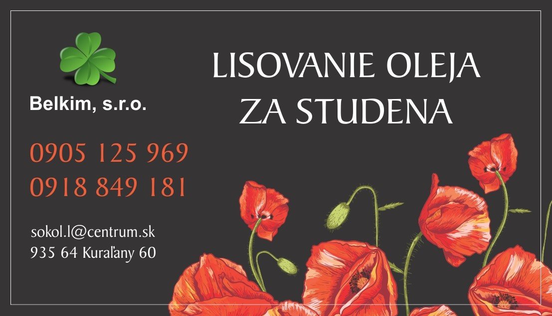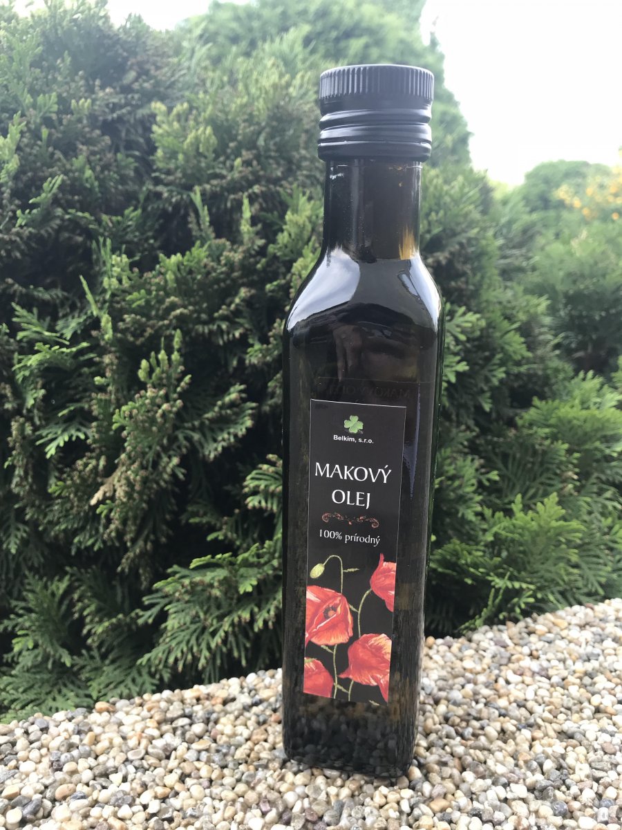 Rodinná firma Belkim, s.r.o. ponúka Makový olej lisovaný za studena. Taktiež ponúkame Tekvicový olej a olej z Pestreca mariánskeho. Spotrebiteľské balenie je 250 ml., avšak po dohode je možné zakúpiť olej aj nenaflaškovaný. Možné je aj dať si u nás vylisovať olej z olejnatých semien. Dohoda istá. www.natur-oil.sk