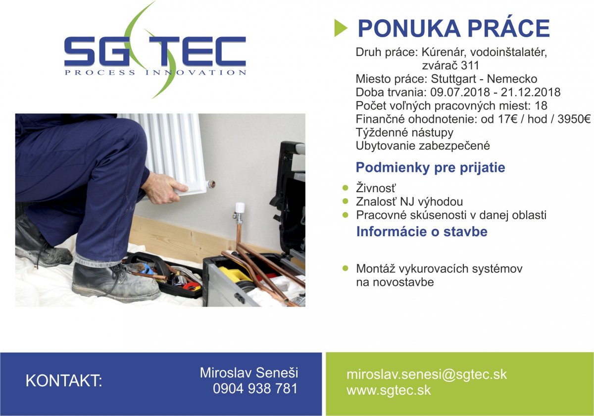 PONUKA PRÁCE: Druh: Kúrenár, vodoinštalatér, zvárač 311 Miesto práce: Stuttgart - Nemecko Doba trvania: 09.07.2018-21.12.2018 Počet voľných pracovných miest: 18 Finančné ohodnotenie: od 17€/hod Týždenné nástupy Ubytovanie zabezpečené Podmienky pre prijatie: *Živnosť *Pracovné skúsenosti v danej oblasti *Znalosť NJ výhodou Informácie o stavbe: *Montáž vykurovacích systémov na novostavbe KONTAKT: SG tec, s.r.o. Veľké Kozmálovce 373 935 21 Miroslav Seneši 0904 938 781 miroslav.senesi@sgtec.sk www.sgtec. sk