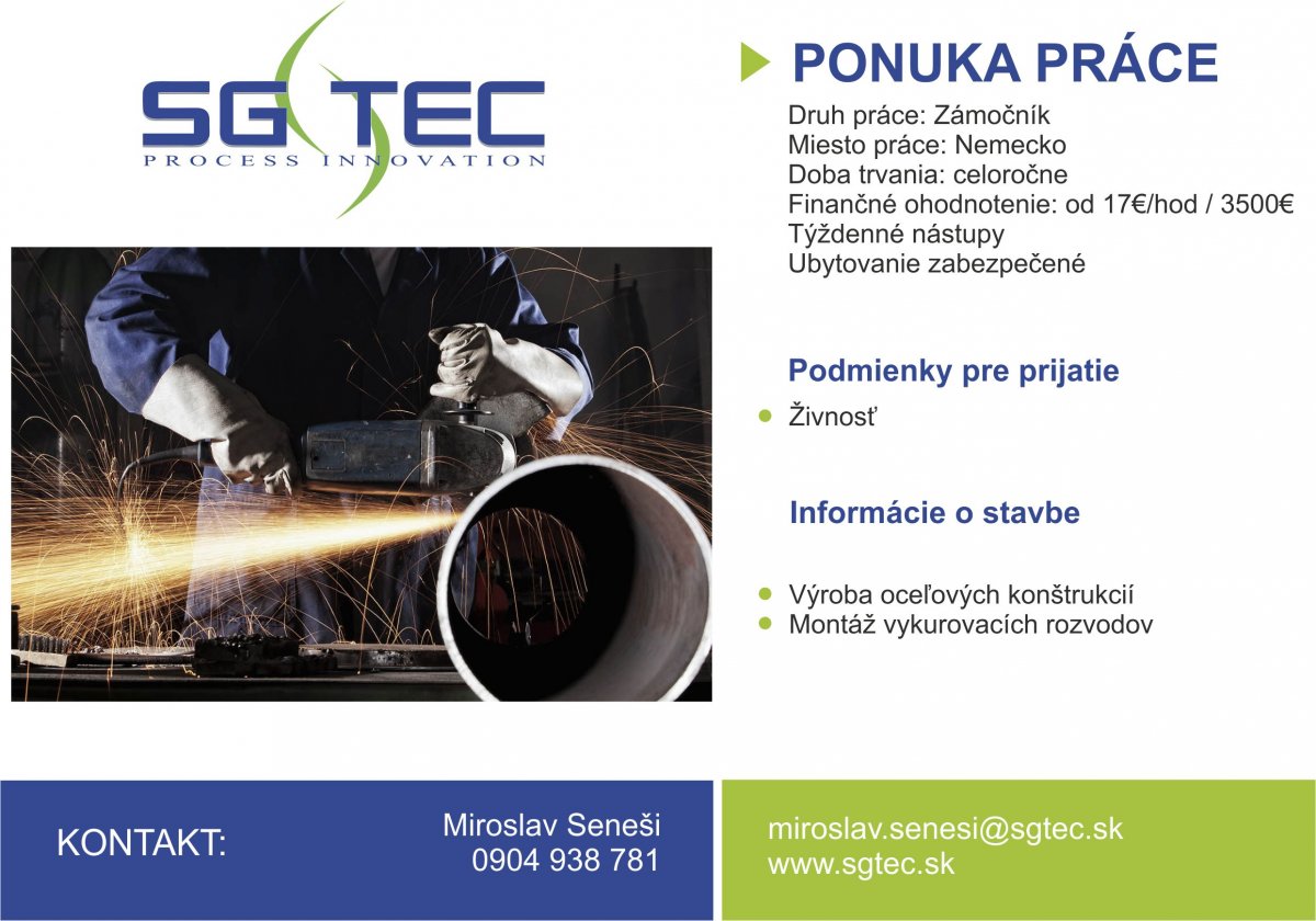 PONUKA PRÁCE: Druh: Zámočník Miesto práce: Nemecko Doba trvania: celoročne Finančné ohodnotenie: od 17€/hod Podmienky pre prijatie: *Živnosť Informácie o stavbe: *Výroba oceľových konštrukcií *Montáž vykurovacích rozvodov KONTAKT: SG tec, s.r.o. Veľké Kozmálovce 373 935 21 Miroslav Seneši 0904 938 781 miroslav.senesi@sgtec.sk www.sgtec. sk