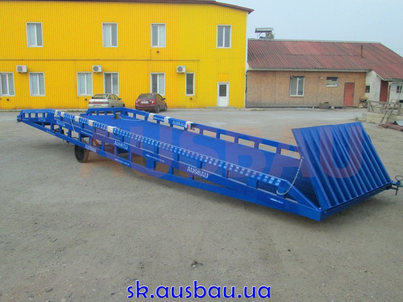 Mobilná hydraulická rampa AUSBAU pre nakladanie a vykladanie kontajnerov a nákladných vozidiel. Technické údaje mobilnéj hydraulickéj rampy pre nakladanie a vykladanie kontajnerov a nákladných vozidiel: nosnosť 6, 8, 10 až 12 ton. Možnosť regulovanie výšky pomocou hydraulického systému (od 90 do 165 cm), celková dĺžka mobilnéj hydraulickéj rampy môže byť 9-13 metrov, veľká platforma. Pomocou mobilnéj hydraulickéj rampy pre nakladanie a vykladanie kontajnerov značne šetríte čas vykladania/nakladania + náklady práce (proces vykladania/nakladania vykonáva len vodič vidlicového vozíka). Kontakty: Tel. +48223906443 https://av-exim.com Mobilná hydraulická rampa AUSBAU má protišmykovú plochu, pohodlnú, mierne naklonenú plošinu, bočné panely sú zabraňujúce neželaným nárazom nákladu, má spoľahlivý hydraulický systém. Vyrábame aj vlastné rampy do 30 t. Viac informácií o mobilných vysokozdvižných vozíkoch AUSBAU mȏžete nájsť na adrese: av- exim.com id: 3AOII8 Ako funguje mobilná hydraulická rampa AUSBAU pre nakladanie a vykladanie kontajnerov a nákladných vozidiel: nakladač zdvihne okraj rampy a privezie ju do vozidla. Pomocou ručnej hydrauliky jedna osoba stlačením rukoväti hydraulického čerpadla nastaví výšku rampy na požadovanú úroveň (od 90 do 165 cm). Po inštalácii mobilná rampa bezpečne upevnená pomocou dvoch reťazí k vozidlu a kolesá sú pripevnené proti pohybu brzdami (reťaze a blokovacie brzdy sú v komplekte spolu s rampou). Ďalej vysokozdvižný vidlicový vozík prechádza po povrchu rampy do karosérie nákladného vozidla alebo železničného vozňa.