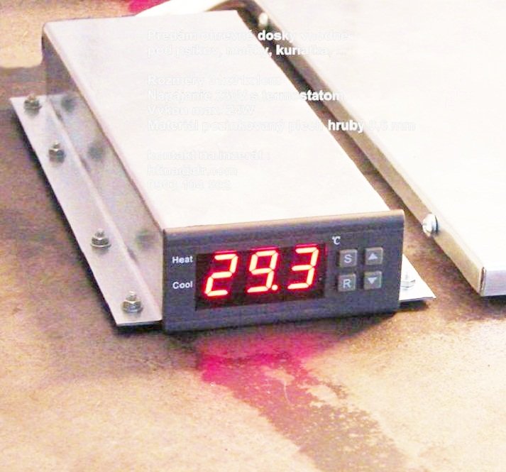 Predam vyhrevna podlozka - ohrevna doska riadena digitalnym termostatom s presnostou 0,1 stupna. Vhodna pre pes, macka, do psej budy, Na obrazkoch verzia za 64 €. - 15 € 31x31x1cm 230V 24W - 24 € 50x50x1cm 230V 24W - 32 € 50x50x1cm 230V 48W - 49 € 31x31x1cm 230V 24W termostat - 54 € 50x50x1cm 230V 24W termostat - 64 € 50x50x1cm 230V 48W termostat - 20 € 31x31x1cm 12V 24W - 27 € 50x50x1cm 12V 24W - 39 € 31x31x1cm 12V 24W termostat - 44 € 50x50x1cm 12V 24W termostat + 5€ postovne