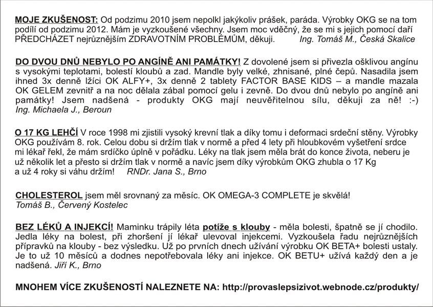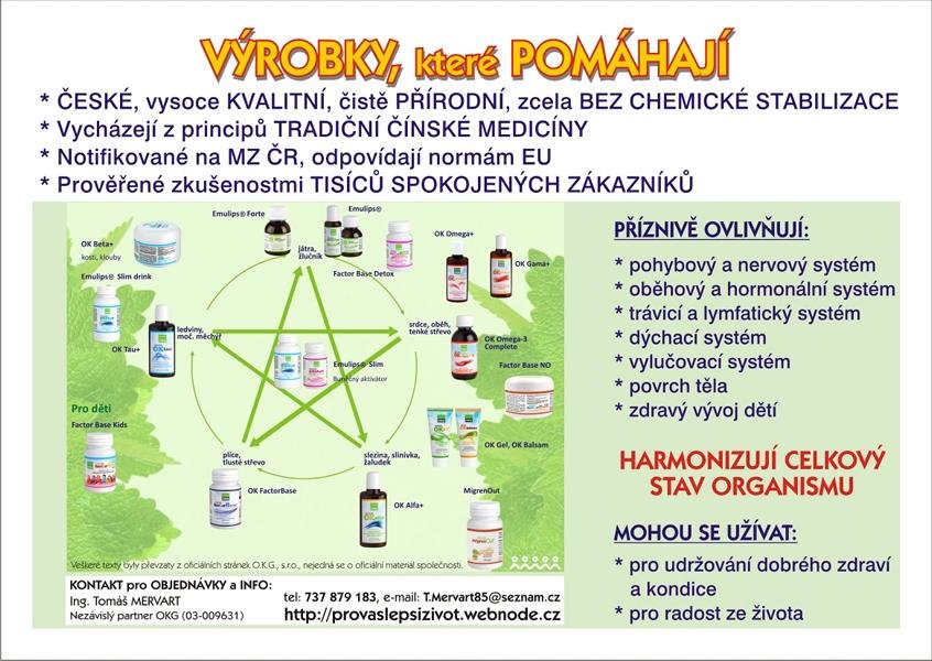 Zdraví není samozřejmostí. O zdraví je třeba pečovat. Účinná péče o vlastní zdraví znamená věnovat mu pozornost dříve, než nastanou zdravotní problémy. Vždyť žijeme v době, ve které platí, že: pokud se nepostaráte o Vaše zdraví sami, pak to za Vás nikdo neudělá. OKG má řešení, které Vám pomáhá každý den upevňovat Vaše zdraví vzácnými a unikátními výrobky z čisté přírody přirozeným působením na Váš organismus. REGISTRUJTE SE k OKG a získejte výraznou slevu na výrobky (na jednom výrobku zakoupeném se slevou ušetříte 5-17 Eur oproti maloobchodní ceně). Registrace je už navždy BEZPLATNÁ (dříve byl poplatek 6,38 Eur), členství je také ZDARMA (dříve se prodlužovalo za 4 Eura na rok), nemáme žádné povinné objemy nákupu výrobků, sleva platí i při nákupu jednoho výrobku. Pozorujte svůj vlastní organismus, protože ve zdravém těle zdravý duch a zdravý člověk má tisíce přání, nemocný jen jedno – být zdravý! Neznám lepší investici než do zdraví. Zájemci pište, rád podám další informace a PORADÍM s výběrem! MOJE ZKUŠENOST: Výrobky OKG UŽÍVÁM preventivně od podzimu 2012 a mám je VYZKOUŠENÉ VŠECHNY. Roky 2009 - 2011 pro mě byly po zdravotní stránce na můj vkus nezvykle náročné, spojené s nepříjemnými vyšetřeními a běháním po doktorech. Streptokok, zánět jícnu a kožní absces (furunkl a karbunkl obličeje) „pěstovaný“ X let až do krajnosti. Na podzim 2012 a na jaře 2013 se o mě několikrát pokoušela chřipka, ale díky výrobkům jsem se udržel po celou dobu práce schopným (na rozdíl od většiny mých kolegyň a kolegů), a to jsem pracoval neustále venku, v zimě i třeba v -10°C v chumelenici. Od jara 2013 už dokonce ani náznak nějaké chřipky apod. Výrobky mi dále kromě posilování imunity pomáhají od namožených svalů, při bolestech zad (zvládám bez léků a injekcí), různých odřeninách atd. Děkuji, děkuji, děkuji, že jsem poznal výrobky OKG! Ing. Tomáš Mervart, nezávislý partner OKG (03-009631).