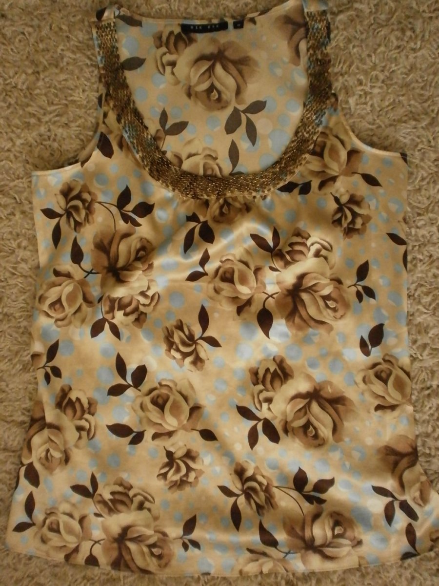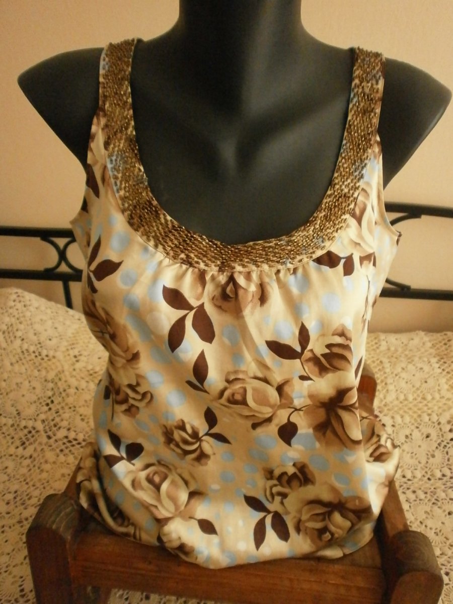 jemný topík v prednej časti výstrihu zdobený medenými korálikmi bledunko béžový podklad s hnedými ružami a bledomodrými guličkami pekná farebná kombinácia strihaný do A nemá žiadne poškodenie dlžka 66 cm cez prsia 46 cm x2 veľ M
